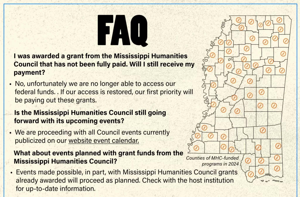 Dear Friends, The Mississippi Humanities Council received notice April 2, 2025 from the Department of Government Efficiency (DOGE) that our federal funding from the National Endowment for the Humanities (NEH) […]