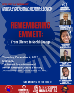 “Remembering Emmett: From Silence to Social Change” is an exhibit by the Emmett Till Interpretive Center in support of the Community Read. This event is also supported by the Mississippi Humanities Council.