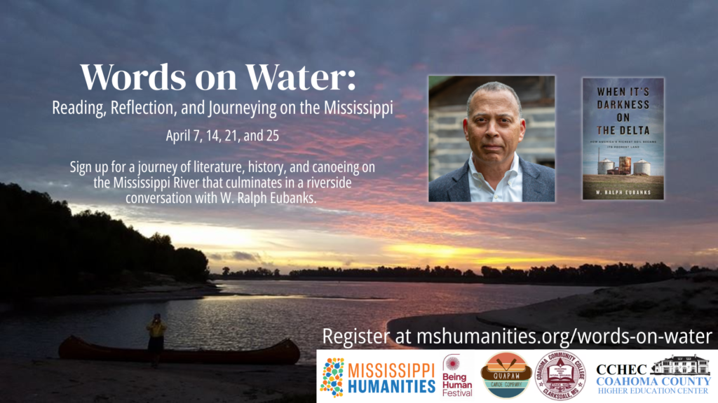 Join the Mississippi Humanities Council for “Words on Water: Reading, Reflection and Journeying on the Mississippi.” This two-week experience will bring together readers, students, educators, and community leaders for thoughtful discussions and a guided canoe journey along the Mississippi River near Clarksdale.